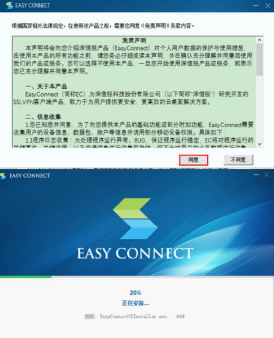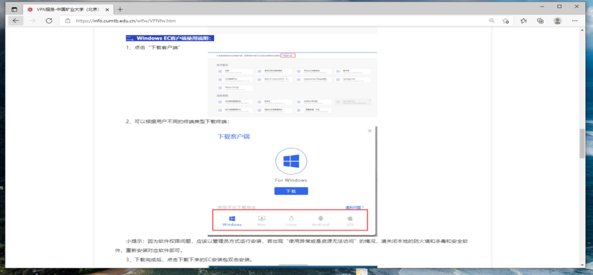 1、下载客户端,下载方法(按照网络与信息中心官网里VPN服务中“windows浏览器登录VPN使用操作说明,” 的提示下载VPNEC客户端,网址是https//info.cumtb.edu.cn)。