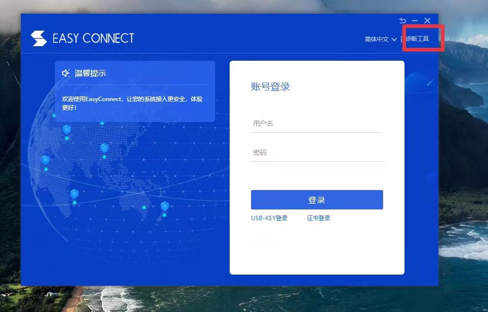 5、点击不需要输入账号密码登录VPN,点击右上角“诊断工具”会跳转连接到web界面帮助中心。