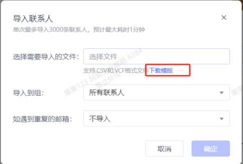 在弹出的界面选择“下载模板”-〉下载后打开,把从原邮箱导出的通讯录表格里对应内容复制到模板中,保存后上传此模板文件。