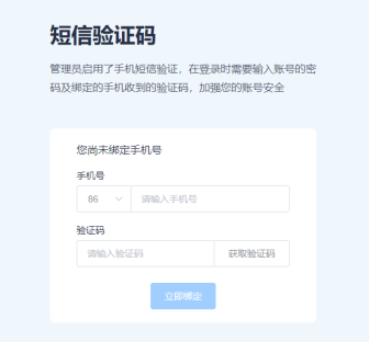 密码通过后,将会提示绑定手机号,使用手机号和验证码进行绑定。