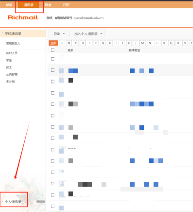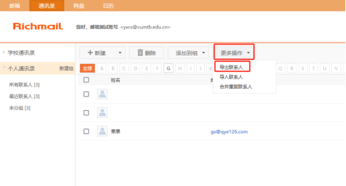 登录原邮件系统后(地址:https://www.cumtb.edu.cn/E_mail.htm),依次点击“通讯录”-〉“个人通讯录”-〉“更多操作”-〉“导出联系人”。