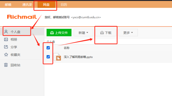 登录原有邮件系统邮箱后(登录地址),依次点击“网盘”-〉“个人盘”-〉“全选所有文件”-〉“下载”。