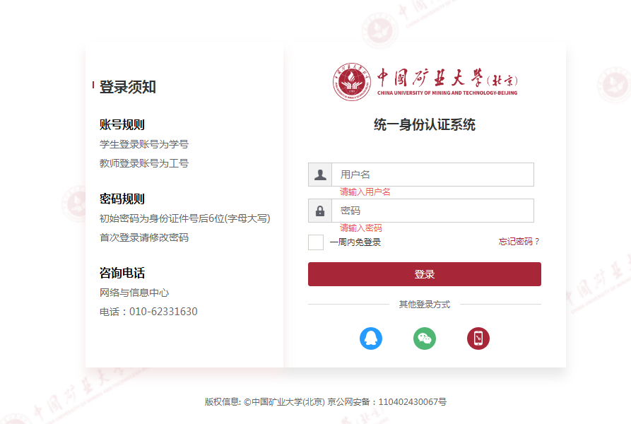 1、在PC上浏览器(建议使用IE或谷歌)的地址栏中输入:https://vpn.cumtb.edu.cn,会跳转到学校的统一身份认证的界面。