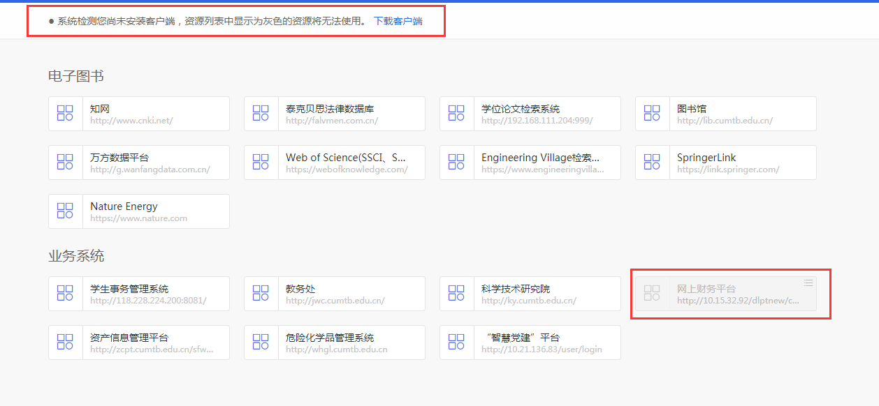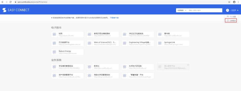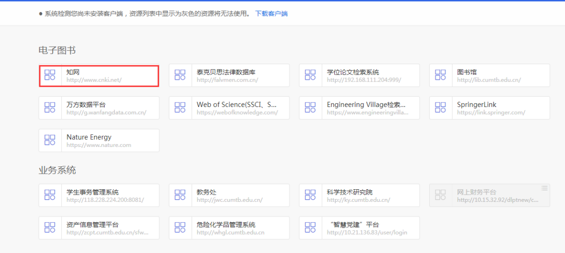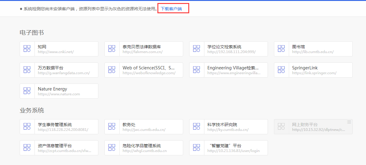 特别提示:如果需要访问显示灰色的资源,需要下载VPN的客户端才能进行访问,具体方法如下: